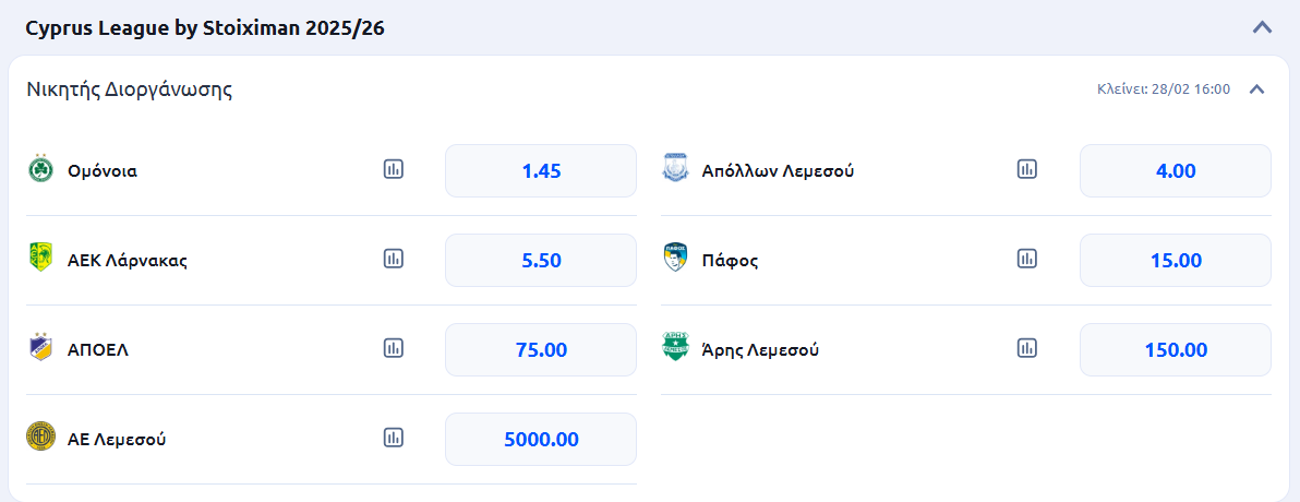 Η ήττα της Ομόνοια Λευκωσίας από τον ΑΠΟΕΛ Λευκωσίας σε συνδυασμό με το γεγονός ότι ο Απόλλων Λεμεσού πλησίασε κι άλλο την κορυφή, έφερε ανακατατάξεις και στις στοιχηματικές αποδόσεις για την κατάκτηση του τίτλου.