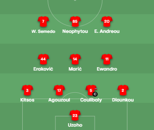Ουζόχο, Ντιουνκού, Κίτσος, Κουλιμπαλί, Αγκουζούλ, Μάριτς, Κόστα, Εράκοβιτς, Σεμέδο, Ανδρέου, Νεοφύτου.