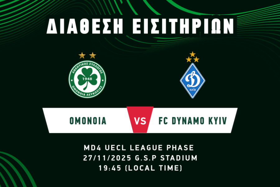 Η Ομόνοια ενημερώνει ότι από σήμερα διατίθενται τα εισιτήρια για τον αγώνα με τη Ντιναμό Κιέβου, για την 4η αγωνιστική του Conference League.