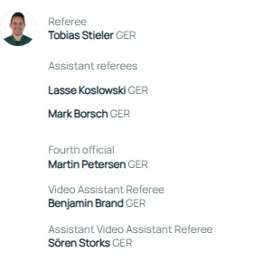 Την αναμέτρηση θα διευθύνει ο Γερμανός Tobias Stieler, ενώ αξίζει να σημειωθεί ότι και όλοι οι υπόλοιποι διαιτητές προέρχονται επίσης από τη Γερμανία.