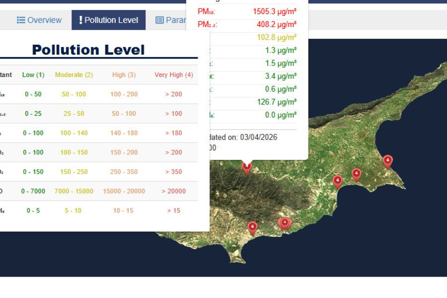 Σύμφωνα με τα επίσημα στοιχεία στην ατμόσφαιρα της Κύπρου παρατηρούνται σήμερα μετρήσεις που σε μερικές περιπτώσεις ξεπερνούν τα 1500 μg/m³, δηλαδή περίπου 30 φορές πάνω από το ασφαλές επίπεδο των 50 μg/m³.