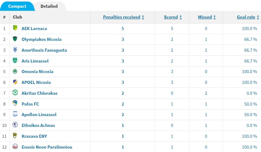 Στον πίνακα με τα κερδισμένα πέναλτι, η ΑΕΚ βρίσκεται στην κορυφή με 5, έχοντας σκοράρει όλα εξ αυτών. Δεν είναι τυχαίο πως η ομάδα της Λάρνακας βρίσκεται πολύ υψηλά στην κατοχή μπάλας στο αντίπαλο τρίτο. Ολυμπιακός, Ανόρθωση, Άρης, Ομόνοια και ΑΠΟΕΛ ακολουθούν με 3 κερδισμένα. Ομόνοια Αραδίππου και ΑΕΛ είναι οι μοναδικές που δεν έχουν κερδίσει ούτε ένα πέναλτι στη φετινή σεζόν.