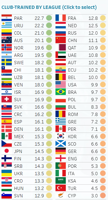 Αυτό φαίνεται μέσα και από τα δημογραφικά δεδομένα του CIES, με το διεθνές παρατηρητήριο ποδοσφαίρου να παρουσιάζει με ποσοστά το πόσο χρόνο δίνουν οι σύλλογοι σε παίχτες που ήταν στις ακαδημίες (για τουλάχιστον τρία χρόνια μεταξύ 15-21 ετών).