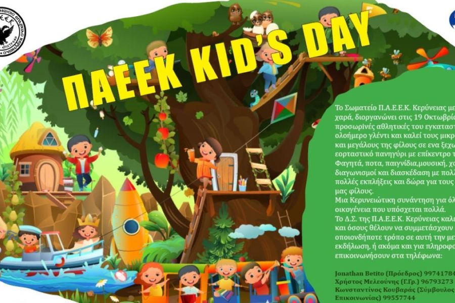 Η Π.Α.Ε.Ε.Κ. Κερύνειας ετοιμάζει μια μοναδική γιορτή για μικρούς και μεγάλους το Σάββατο 19 Οκτωβρίου, στις προσωρινές της αθλητικές εγκαταστάσεις. Πρόκειται για ένα ημερήσιο πανηγύρι με επίκεντρο το παιδί, αλλά με διασκέδαση που υπόσχεται να καθηλώσει και τους μεγαλύτερους.
