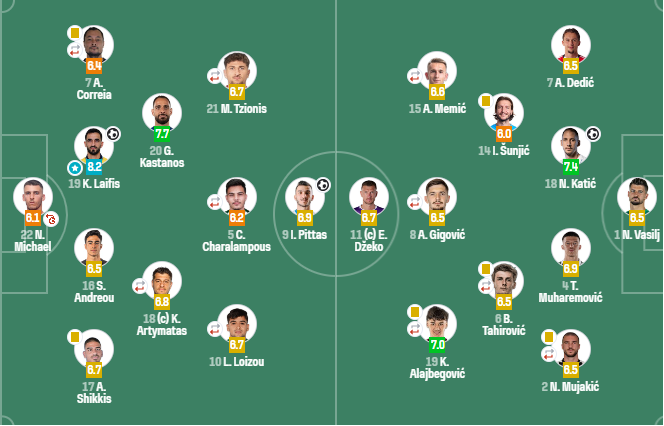 Για τους Βόσνιους ξεχώρισαν σύμφωνα πάντα με το «sofascore» οι Μπαιρακτάρεβιτς (7,5), Κάτιτς (7,4) και Αλαιμπέγκοβιτς (7,0).