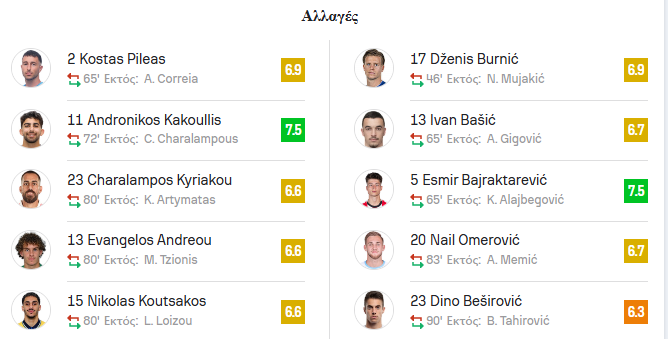 Από πλευράς της Κύπρου βαθμολογία με πάνω από 7,0 πήραν επίσης οι Γρηγόρης Κάστανος (7,7), αλλά κι ο Ανδρόνικος Κακουλλής (7,5) που μπήκε στο ματς ως αλλαγή και κέρδισε το πέναλτι.