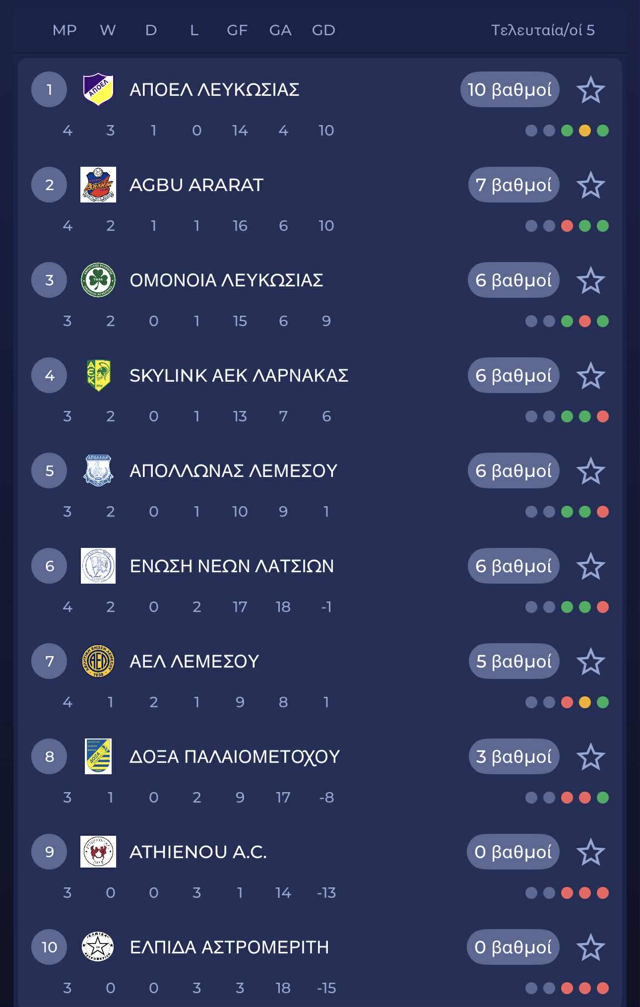 Αρχικά στο «Νίκος Σολωμονίδης» ΑΕΛ και Αραράτ εξήλθαν ισόπαλοι 1-1, ενώ o ΑΠΟΕΛ νίκησε 0-5 την Ένωση Νέων Λατσιών και βρίσκεται μόνος στην κορυφή της βαθμολογίας με 10 βαθμούς.