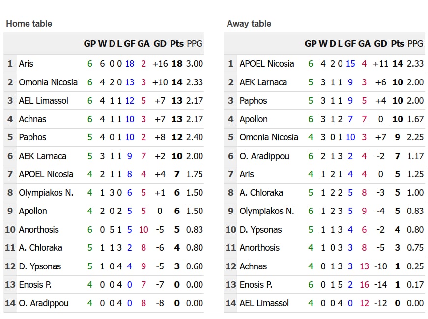 Βάζοντας τα δεδομένα σε μια σειρά, την καλύτερη έδρα του πρωταθλήματος έχει ο Άρης, ο οποίος σε 6 παιχνίδια στη Λεμεσό μέτρησε ισάριθμες νίκες, έχοντας 18 βαθμούς με 18 τέρματα υπέρ και μόλις 2 κατά. Ακολουθεί η Ομόνοια με 14 πόντους σε 6 παιχνίδια (4 νίκες, 2 ισοπαλίες), έχοντας σκοράρει 13 τέρματα στο ΓΣΠ, ενώ δέχθηκε 3. Οι δύο ομάδες, μαζί με τον Ολυμπιακό, είναι οι μοναδικές που δεν έχουν ήττα στην έδρα τους.
