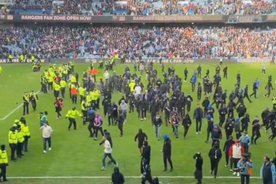 Η κατάσταση ξέφυγε γρήγορα, καθώς φίλοι της Ρέιντζερς από την αντίθετη πλευρά του γηπέδου μπήκαν επίσης στον αγωνιστικό χώρο, με αποτέλεσμα να προκληθεί ένταση ανάμεσα στις δύο πλευρές. Αντικείμενα και φωτοβολίδες εκτοξεύθηκαν, ενώ οι αστυνομικοί και οι προσπάθησαν να σχηματίσουν ανθρώπινο τείχος για να χωρίσουν τους οπαδούς.