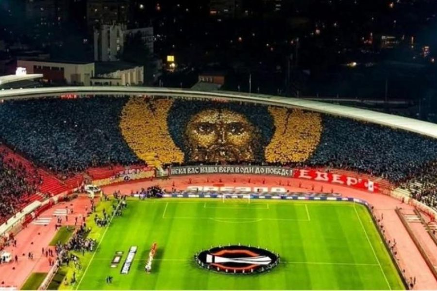 Οι οπαδοί του Ερυθρού Αστέρα εκτός από το κορεό θρησκευτικού περιεχομένου είχαν και ένα πανό με μήνυμα σε αυτό: «Ας σε οδηγήσει η πίστη στη νίκη».