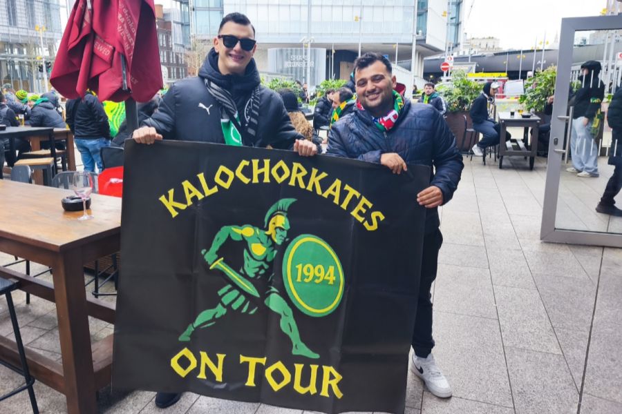 Ο Ανδρέας Φιλίππου και ο Λευτέρης Χρυσοστόμου από το Καλό Χωριό έκαναν ταξίδι για την αγαπημένη τους ΑΕΚ στο Λονδίνο, φτιάχνοντας και το πιο πάνω πανό της φωτογραφίας.
