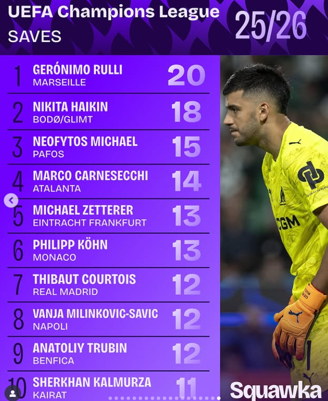 Επίσης ο Κύπριος διεθνής τερματοφύλακας είναι 3ος στη λίστα με τις περισσότερες αποκρούσεις στην κορυφαία διασυλλογική διοργάνωση.