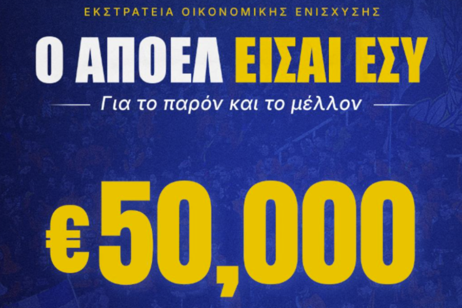 «Ευχαριστούμε τον κάθε ΑΠΟΕΛιστα που έχει συνεισφέρει μέχρι στιγμής, συμμετέχοντας στην προσπάθεια οικονομικής ενίσχυσης «Ο ΑΠΟΕΛ ΕΙΣΑΙ ΕΣΥ, Για το παρόν και το μέλλον» ξεπερνώντας μέσα σε 4 ώρες, το ποσό των €50,000.»